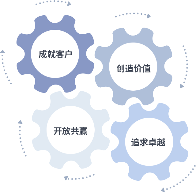 成就客户是一切决策的出发点,,,,创造价值是衡量所有工作的标准,,追求卓越是我们做事做人的态度,,,,开放共赢是我们的格局也是最终的结果。。。价值观的齿轮环环相扣,,,,推动着组织里的每个人不断向前。。。。